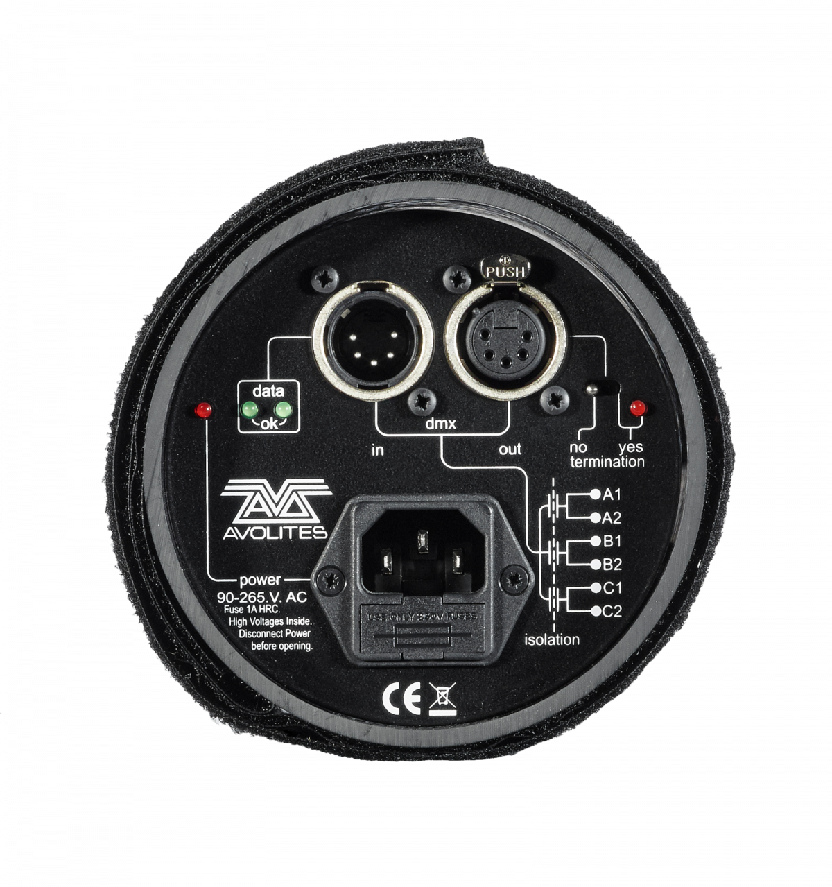 配有:DMX in,DMX 環(huán)路輸出,切斷開關(guān)和 LED 顯示,額外的電源和數(shù)據(jù) LED 燈顯示;