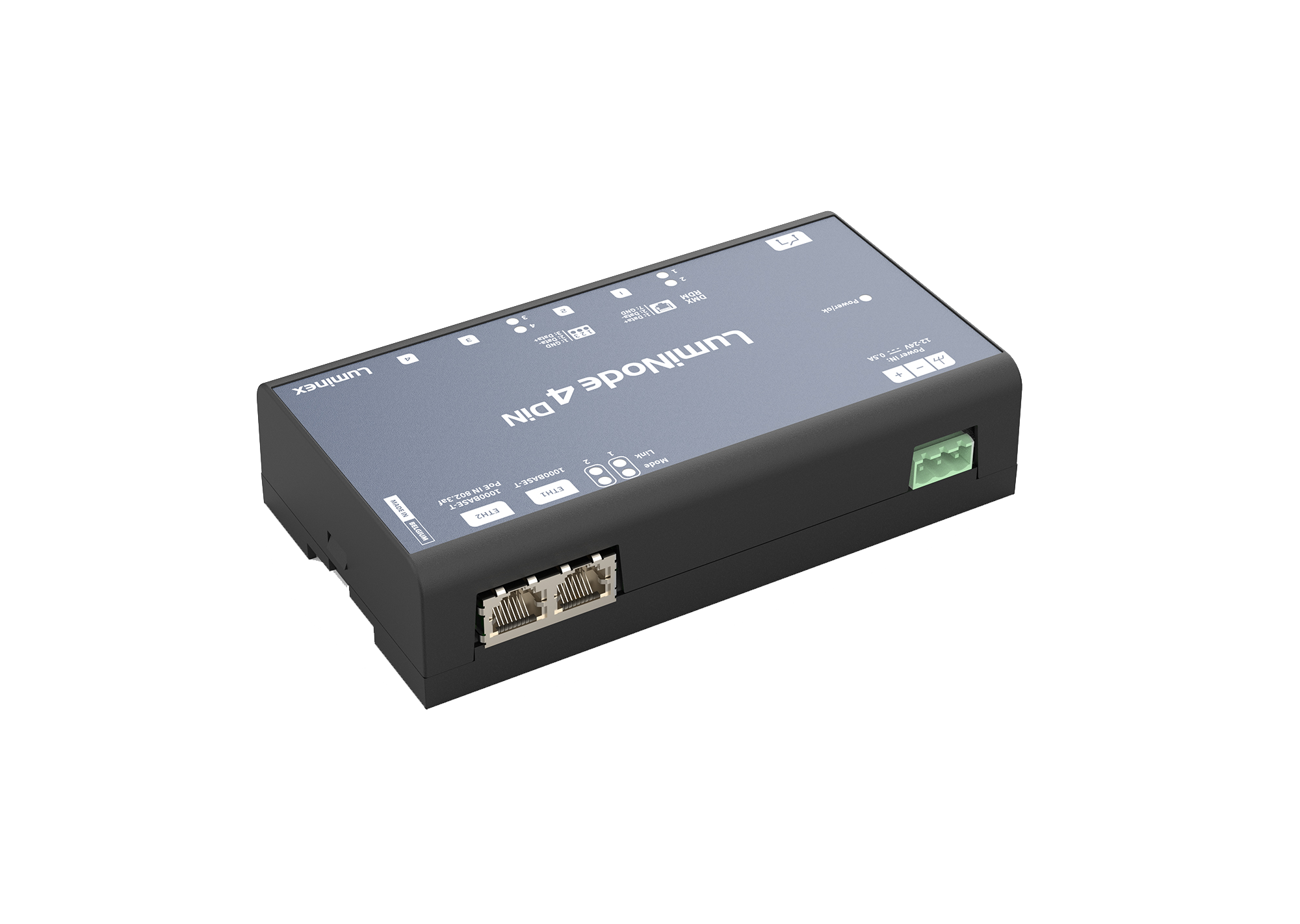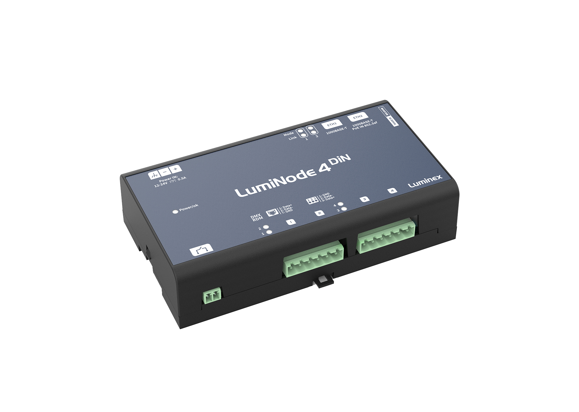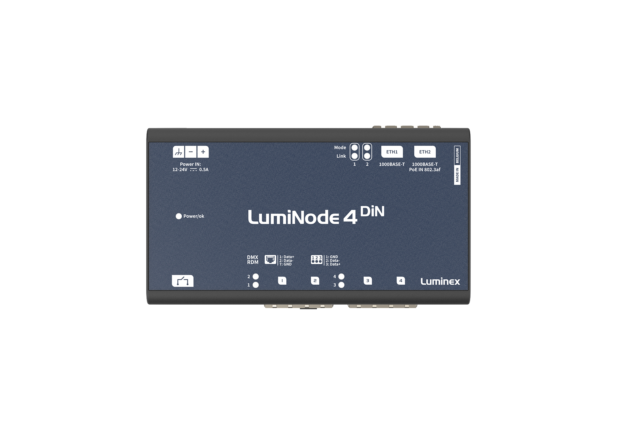LumiNode 4 DIN 與為固定安裝而設(shè)計(jì),可安裝在標(biāo)準(zhǔn) DIN 導(dǎo)軌上。緊湊的設(shè)計(jì)和標(biāo)準(zhǔn)化的安裝支架是建筑娛樂應(yīng)用和安裝項(xiàng)目的理想選擇。為了獲得充分的靈活性,該裝置配備了 DMX/RDM RJ45 連接器或接線端子。該裝置可以通過 PoE 或直流電壓供電。第二個(gè) 1Gb RJ45 以太網(wǎng)端口可用于連接任何其他應(yīng)用程序或下一個(gè) LumiNode 4 DIN(直流供電)。每個(gè) DMX/RDM 端口都是完全先學(xué)和電隔離的,并丏可以配置為輸入或輸出。支持所有相關(guān)的行業(yè)標(biāo)準(zhǔn)協(xié)議,如 Art-Net、sACN、KiNET、RTTRpl (Blacktrax),并丏可以通過支持HTP、LTP、Crossfade、Backup、Switch 和帶有軟補(bǔ)丁的自定義合并模式的 6 個(gè)板載處理引擎進(jìn)行處理和轉(zhuǎn)換功能。